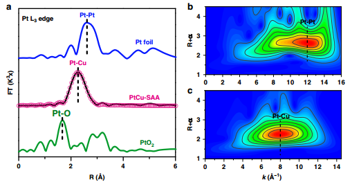 (a)的Pt标样、PtCu-SAA和PtO2标样的Pt-L3边EXAFS傅里叶变换谱图;(b) Pt标样的EXAFS小波变换谱;(c) PtCu-SAA的原位EXAFS小波变换谱。