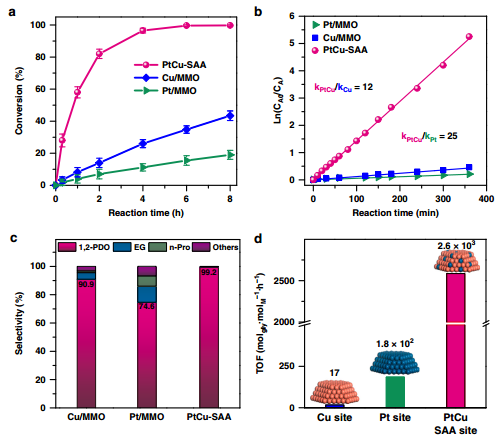 PtCu-SAA、Pt/MMO和Cu/MMO对甘油氢解的性能评价: (a)转化率与反应时间的关系,(b) ln (CA0 / CA)与反应时间关系,(c)产物选择性分布和 (d) TOF值