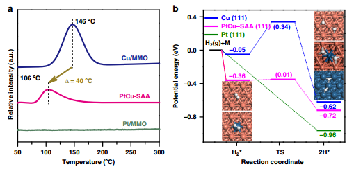 (a) N2O氧化预处理后Pt/MMO、PtCu-SAA和 Cu/MMO样品表面的H2-TPR谱;(b) Pt/MMO、PtCu-SAA和Cu/MMO (111)面的H2解离的势能分布图。