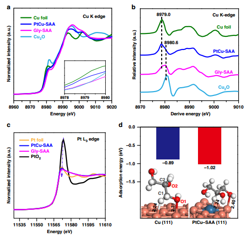 Cu标样、Cu2O标样、PtCu-SAA和通入甘油的SAA(简称Gly-SAA)的 (a)Cu-K边归一化的XANES谱图,(b) 经傅里叶变换的Cu-K边谱图,(c) Pt-L3边归一化的XANES谱图;(d)甘油在PtCu-SAA(111)和Cu(111)晶面上的的吸附能。