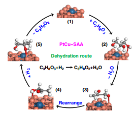在PtCu-SAA催化剂表面甘油氢解为1,2- PDO的反应机理示意图。