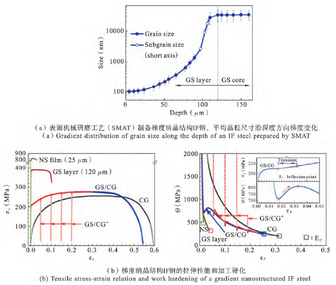 Wu等人在无间隙原子(IF)钢中制备出典型的梯度纳米结构,从表面至内芯,平均晶粒尺寸从96nm逐渐增大到35μm,研究发现随着应变的增加,IF钢的加工硬化率会出现“降低-增加-降低”的过程,即加工硬化率在屈服阶段会出现意外的反转[11],如图10所示。