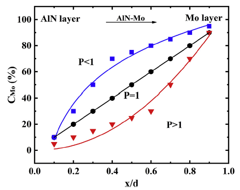 武汉理工大学Chen等人利用SPS方法制备了AlN-Mo梯度功能材料,并分析了微观组织对该材料力学性能的影响[12]。首先,他们定义了表征梯度功能材料的成分参数p与Mo的质量分数CMo的关系可由以下方程确定: