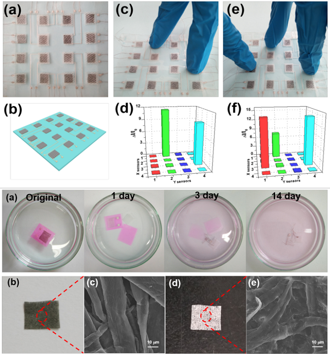 图10 压力传感器制备成的电子皮肤和其降解实验结果