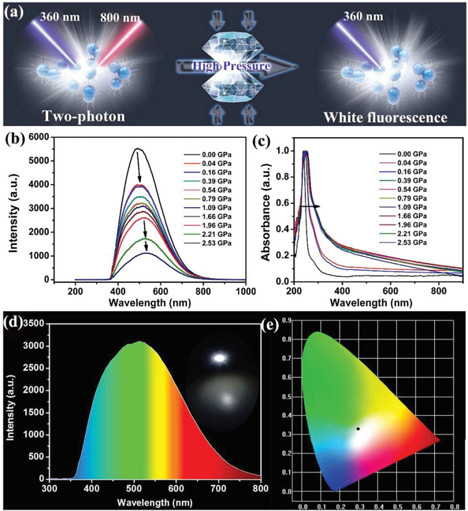 最近,二维无机材料MXenes受到了广泛的研究与关注。如果能够将它们的尺寸从2D片层状变为0D的量子点(QDs),我们就能得到更多有用的性质和功能,如用于光致发光和光催化等。然而,这方面的研究却比较少,已有的研究也表明Ti3C2 MXene量子点(Ti3C2 MQDs)仅能发出蓝色荧光。鉴于此,郑州大学的卢思宇,吉林大学肖冠军和河南理工大学刘宝忠团队合作开发了一种简易高效的制备具有强烈白色荧光的Ti3C2 MQDs的方法[6]。最终制备的Ti3C2 MQDs产物厚度大约为2层,尺寸大约为13.1 nm(图11)。重要的是,合成出的Ti3C2 MQDs表现出强烈的双光子白色荧光。作者也研究了Ti3C2 MQDs在高压条件下发光性质:它仍然能够发出稳定的白光但颜色从冷白色变为暖白色(图12)。进一步地,作者还将Ti3C2 MQDs在聚二甲硅氧烷(PDMS)溶液中进行聚合制备出了纳米复合材料,并将这种能够发出亮白色光的复合材料应用在了白光LEDs中。这个工作为调控MXene材料的尺寸提供了一种简易通用的方法,并能够进一步地促进MXene材料在光学领域的应用。