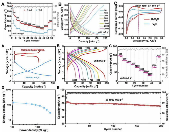 图4 K–V2C MXene材料在半电池和全电池中的电化学性能