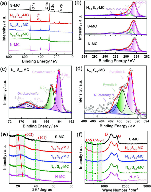 (e,f)N-MC,N0.2S0.8-MC,N0.5S0.5-MC,N0.8S0.2-MC和S-MC的XRD图谱和拉曼光谱。