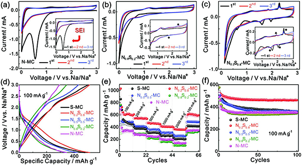 目前,锂离子电池(LIBs)已成为使用最为普遍的能量存储装置。然而,巨大的产业需求与锂资源严重不足之间的严重矛盾迅速抬高了锂金属的价格限制了LIBs进一步的广泛应用。室温钠离子电池(RT-SIBs)凭借丰富的钠资源和与LIBs类似的电化学行为,引起了广泛的研究关注。但是,由于钠离子的原子半径(1.02Å)较锂(0.76Å)大,导致电极材料在脱/嵌过程中发生更严重的体积膨胀。为了进一步开发RT-SIBs技术,需要开发合适的电极材料。鉴于碳基负极材料优异的储钠性能,许多研究工作集中在提升表面积(SSA)和调控材料的孔径。然而,大的SSA由于SEI 的过度形成,会导致首次库伦效率低。此外,大多数碳基负极材料,其可逆容量均不超过300 mAh g-1,这远远不能满足先进电动设备的需求。杂原子掺杂可以有效地调节碳基负极的理化性质。氮和硫是最常被研究的杂原子,因为氮掺杂显著改善了电极界面与电解液之间的导电性和表面润湿性;硫掺杂可以显着提高容量和拓宽层间距,这对于钠离子的嵌入行为有很大的帮助。但是,其储钠机理仍需要得到进一步的阐明。