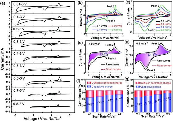 近日,华中HTH官网地址 大学王得丽教授(通讯作者)团队采用了一种超交联的聚合策略用来构建超交联的微孔吡咯/噻吩复合物材料,,并改变初始投料比精确调控其活性位点的分布,进而深入探究了其储钠贡献机制。通过不同截止电位下的CV测试发现其储钠机理可细分为高电位 (0.8-3.0 V) 的法拉第赝电容贡献,中电位 (0.3-0.8 V) 的微孔吸附贡献以及低电位 (0.01-0.3 V) 的碳层嵌入式贡献,解释了材料较高的储钠容量。除此之外,利用不同电位下的ex-EIS 和ex-XPS探究了储钠过程中活性位点发生的相转变过程的具体过程,并通过拟合不同扫描速率下的CV曲线得到了其容量贡献机制,解释了该材料优异的倍率,循环性能。相关研究成果“Accurate Control Multiple Active Sites of Carbonaceous Anode for High Performance Sodium Storage: Insights into Capacitive Contribution Mechanism”为题发表在Advanced Energy Materials上。
