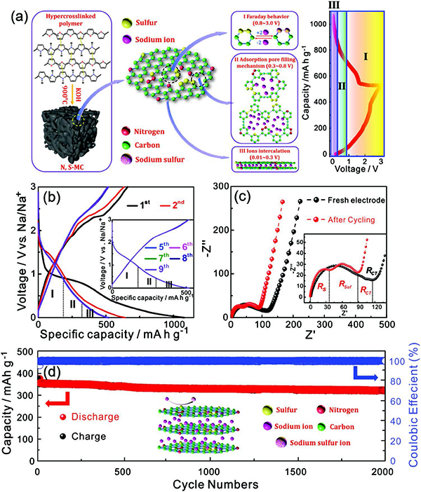 作者通过一步超交联聚合策略成功地制备了具有多活性位点(硫(14.8 wt%)和氮(4.5 wt%))的多孔碳材料(N,S-MC)。值得注意的是,起始单体中的单一噻吩硫已部分转化为长链硫,进而通过电化学转换为硫醇阴离子,从而提供较高的法拉第赝电容贡献。此外,多孔结构有效地增加了中电压(0.3-0.8 V)处的物理吸附电容行为,而低电压(0.01-0.3 V)处的部分石墨化碳晶格嵌入容量归因于大量掺杂S拓宽了层间距。因此,所植被的N0.2S0.8-MC在100 mA g-1时表现出521 mAh g-1的高可逆容量,同时也具有优异的倍率性能(2000 mA g-1时可提供365 mAh g-1)和出色的循环稳定性。这项工作为碳基负极材料储钠的容量贡献提供了深入的理解,并阐明了在杂原子掺杂碳基负极的储钠反应期间的相转变。
