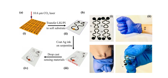 (a) 基于激光诱导石墨烯的气体传感平台加工示意图