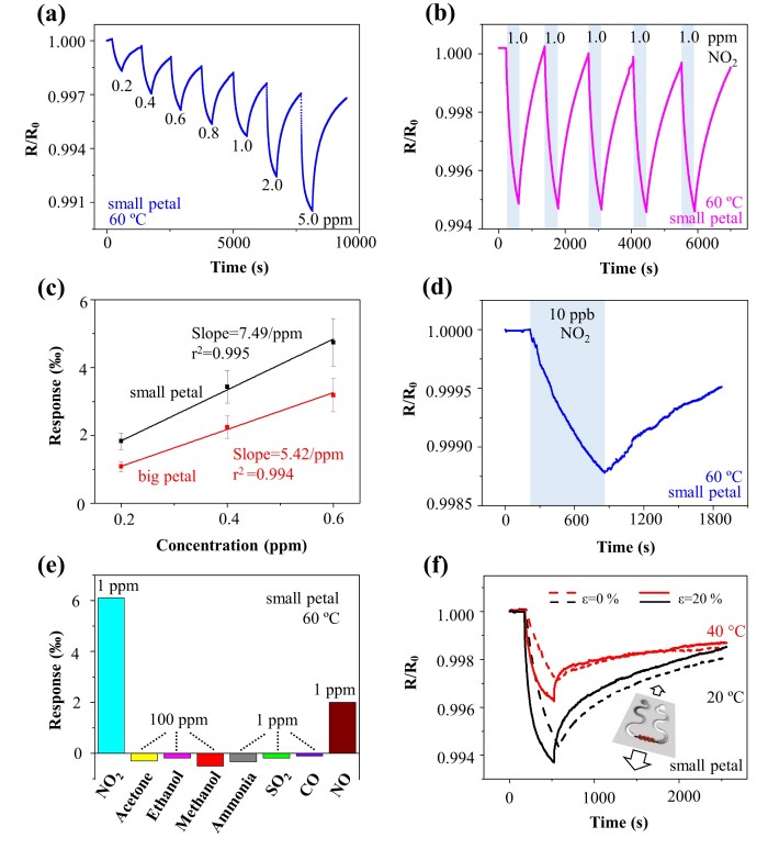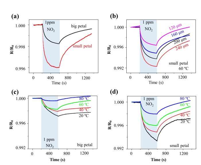 (a)自加热到60°C时,“大花瓣”与“小花瓣”结构典型的气体响应曲线