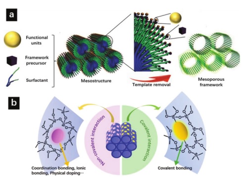 b) 介孔二氧化硅骨架中光学元件的共价键合和非共价相互作用。