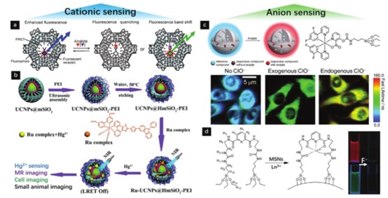d) 镧系发光介孔纳米材料检测氟化物。