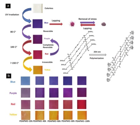 a) PDAPMOs在不同温度下的颜色转变;
