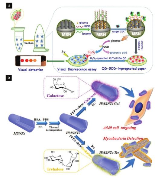 b) 功能化HMSNT的制备以及用于细胞靶向和细菌检测。