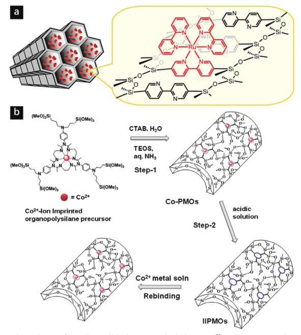 a) 在PMOs中组装的Ru配合物的示意图;