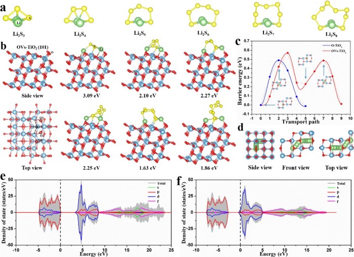 (a)多硫化物结构优化图;(b)多硫化物在OVs-TiO2表面吸附结构图;(c, d) 锂离子在OVs-TiO2中的迁移能垒及结构示意图;(e, f)无氧缺陷二氧化钛和氧缺陷二氧化钛的DOS图谱。