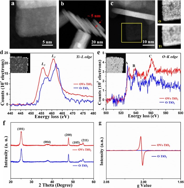 (a-c) OVs-TiO2的STEM图像;(d, e)EELs图谱;(f)XRD图谱;(g)EPR图谱。