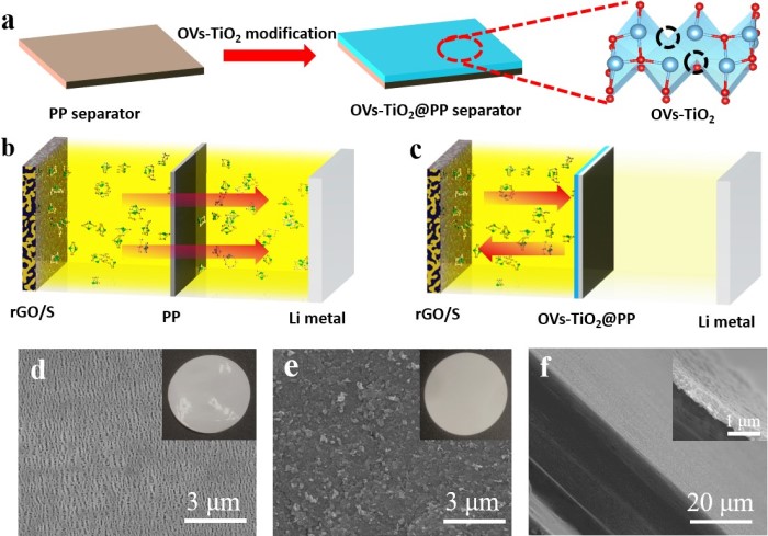 (a-c) OVs-TiO2@PP separator的制备及作用机理示意图;(d) PP隔膜的SEM图像;(e, f) OVs-TiO2@PP separator的SEM图像。