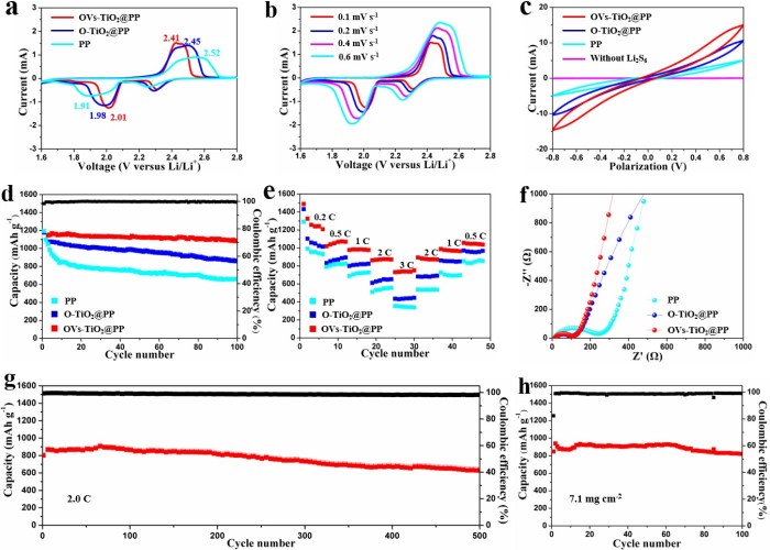 (a)CV曲线;(b)多扫速CV曲线;(c)对称电池测试;(d)0.5 C下的循环性能图;(e) 倍率性能图;(f)EIS图谱;(g)2.0 C下的长循环性能图;(h)高负载循环图。