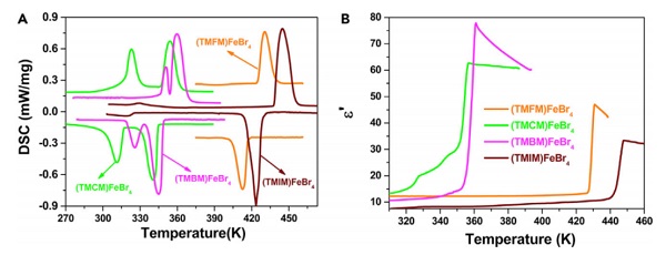 (A)(TMFM)FeBr4,(TMCM)FeBr4,(TMBM)FeBr4和(TMIM)FeBr4的温度依赖性SHG强度