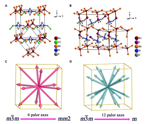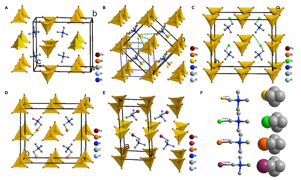 通过精确的分子修饰或剪裁,作者成功设计和调节了四种高温多轴分子铁电体(TMFM)FeBr4,(TMCM)FeBr4,(TMBM)FeBr4和(TMIM)FeBr4。通过化学方法,用F到I的卤素原子取代H原子,原来的中心对称[(CH3)4N]+阳离子变成准球形TMFM,TMCM,TMBM和TMIM阳离子,使这四种化合物在极性下结晶空间群并经历铁电相变。此外,所有这些多轴铁电体均表现出良好的压电性能,由此(TMFM)FeBr4表现出与PVDF相当的较大压电响应。这种精确的分子设计策略为多轴分子铁电体的设计和调节提供了可行的方向,这对进一步探索结构与铁电之间的关系具有重要意义,为现代能源和人工智能领域的发展提供了新的机会。