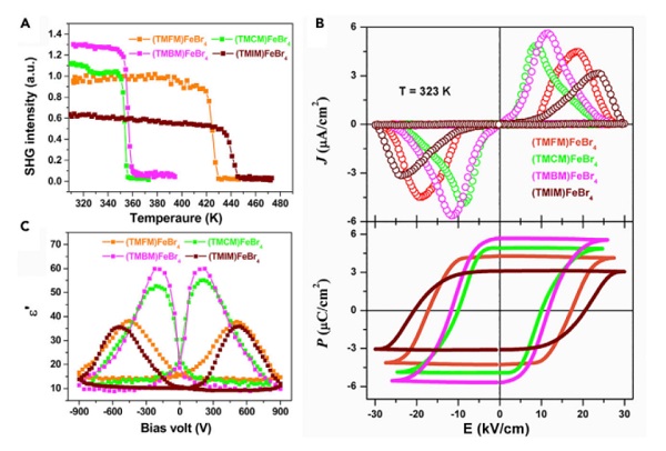 (B)使用双波法在323 K下测量的(TMFM)FeBr4,(TMCM)FeBr4,(TMBM)FeBr4和(TMIM)FeBr4的P-E磁滞回线