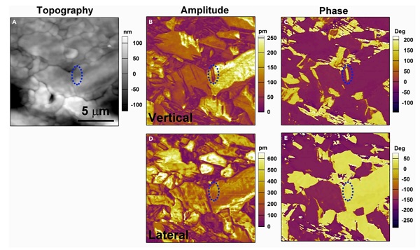 (B-E)同一区域中的垂直PFM振幅(B)和相位(C)图像以及侧面PFM振幅(D)和相位(E)图像
