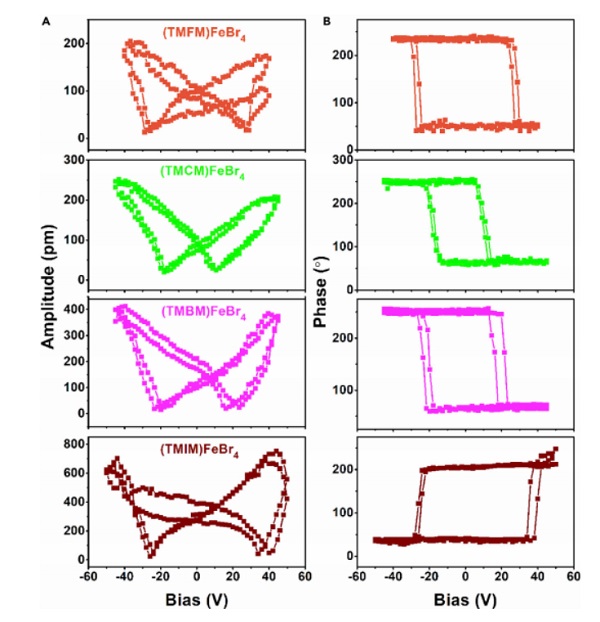 (TMFM)FeBr4,(TMCM)FeBr4,(TMBM)FeBr4和(TMIM)FeBr4薄膜的局部振幅(A)和相位(B)磁滞回线