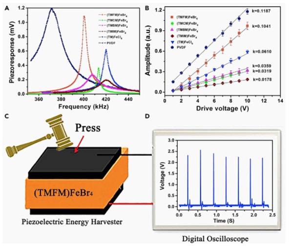 (C)基于(TMFM)FeBr4膜的压电能量收集器的示意图