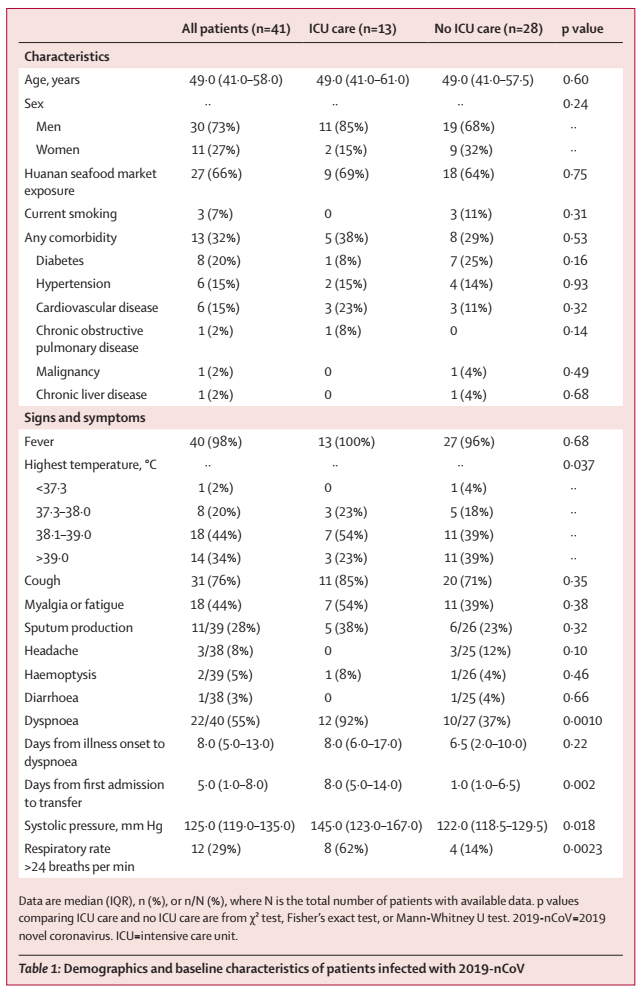 表1:2019-nCoV患者的人口学特征和基线特征