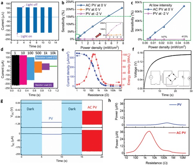 作者也对交流光伏效应的应用作了详细演示(图3)。交流光伏效应可以使得普通的器件就能作为高性能宽带光电探测器,在零偏置下具有极高的灵敏度,无需复杂加工。同时,它还可以作为远程电源提供相比于传统的光伏效应更高的瞬时功率输出。该文报道了,简单合成的p-Si/TiO2的器件利用这一效应能够在零偏置下具有极高的灵敏度对广域的光都有极高的灵敏度(2.09 ),比通常的pn光伏效应高2051倍,并且有很快的相应速度( ≈20μs )。并且,通过这一效应,商业化的硅太阳能电池在测试的条件下,相比于传统的pn光伏效应,也能提高其11.2倍的输出功率,而这提高的能量来自于产生非平衡态的机械能。也就是说,交流光伏效应提供了一种新的能量转换方式,将机械能转换为电能。这一新的能量转换方式的发现可能将产生革命性的影响。