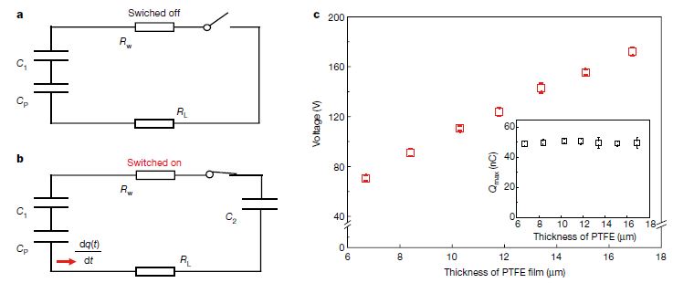 香港城市大学的王钻开、内布拉斯加大学林肯分校的曾晓成以及中科院北京纳米能源与系统研究所的王中林(共同通讯作者)等人联合发文报道制备了一种从冲击水滴中富集能量的新型器件。该器件是利用液滴浇铸式聚四氟乙烯在铟锡氧化物(ITO)基质上与铝电极沉积成膜而成。在连续水滴的冲击下,聚四氟乙烯薄膜表面引发高密度电荷,并进一步在ITO上诱导形成等量的相反电荷,实现在铝电极上的电荷转移。研究表面,这一薄膜器件上发生的水滴冲撞能够将原本不相连的组分搭建成闭环电学系统,将界面效应转变成体效应,从而实现瞬时功率密度的数量级增长。2020年02月05日,相关成果以题为“A droplet-based electricity generator with high instantaneous power density”的文章在线发表在Nature上。