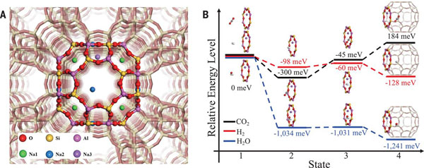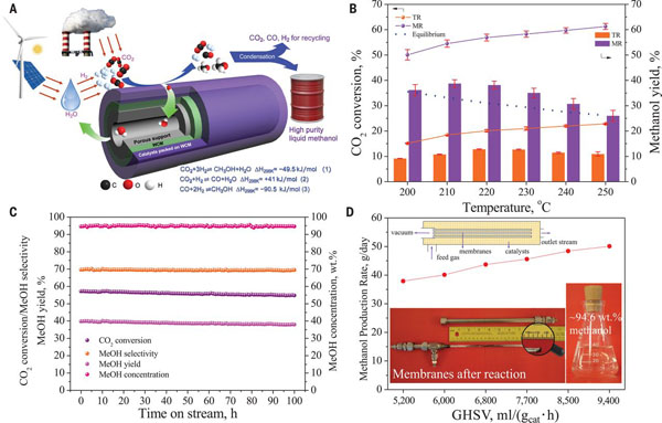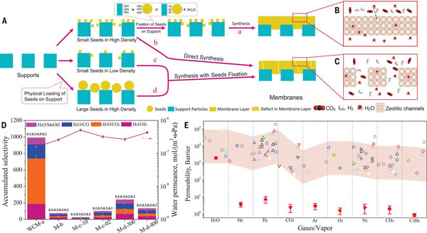 我们探索了是否可以制造纳米通道,以在高温和高压条件下排斥大约为水合离子大小(如Na+,6.6Å)的小气体分子,以用于催化。例如,副产物水强烈抑制了CO2加氢成液体燃料(如甲醇)的动力学和热力学。疏气导水纳米通道可以通过除去水,保留反应气体和产物的同时,可以提高反应速率,使平衡向产物生成方向转移。但是,能够区分水分子(动力学直径2.6Å)和小至H2(动力学直径2.9Å)的气体分子的埃级纳米通道非常具有挑战性。此外,需要将纳米通道在没有缺陷的情况下组装成可以在> 200°C和> 20 bar的压力下运行的实用分离膜。