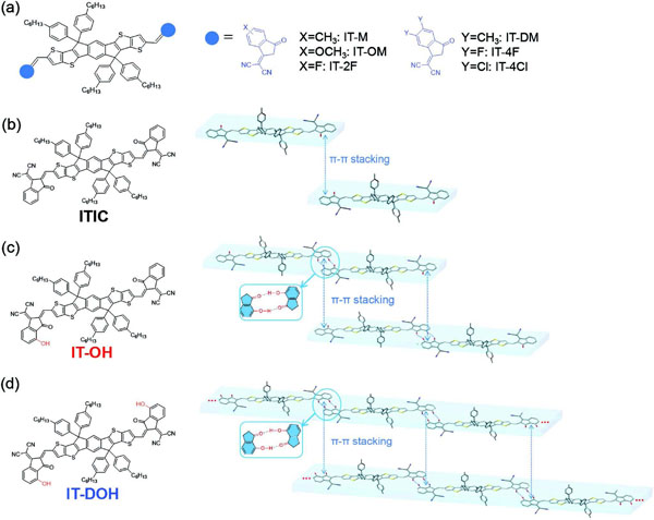 b-d)ITIC(b),IT-OH(c)和IT-DOH(d)的分子间堆积模型示意图。