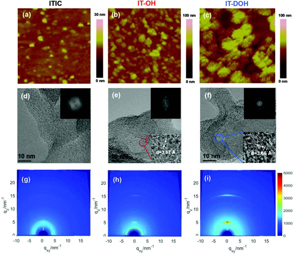 ITIC、IT-OH和IT-DOH薄膜的原子力显微镜(AFM)高度图像(5 µm×5 µm,a-c),HRTEM图像(d-f)和2D GIXD图像(g-i)。