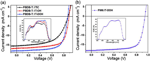 b)PM6:IT-DOH的非退火OSCs的J-V曲线和EQE光谱。
