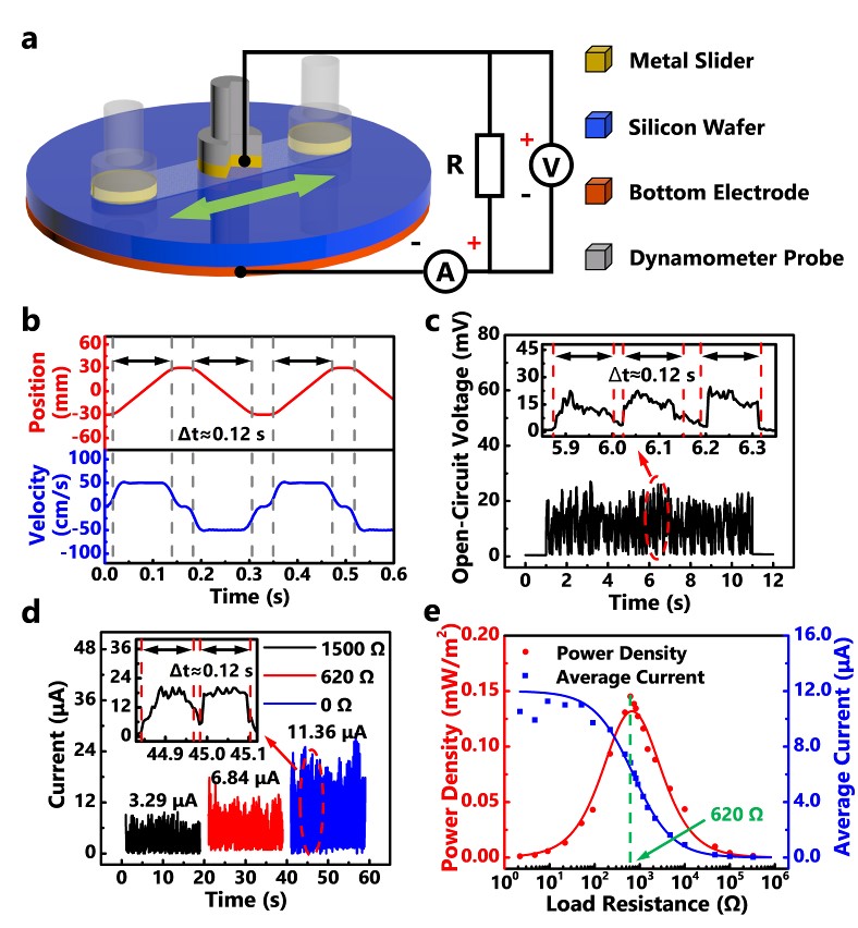 随着物联网的发展,能源需求飞速增长,且变得更加分散化、小型化、环保和可持续化,这些为环境能源收集都带来了新的挑战。摩擦纳米发电机(TENG)作为一种新能源技术,具有重量轻,体积小,材料选择广泛,能量转换效率高的特点,可以满足信息化社会的需求。基于接触起电和静电感应效应耦合,传统TENG通常使用有机聚合物绝缘材料,摩擦产生的电荷会堆积在材料表面,并通过改变接触面积或分离距离,提供交变电流到外部电路,具有非常大的阻抗(MΩ-GΩ)。最近,基于半导体材料的摩擦纳米发电机逐步开展了研究,比如基于金属-绝缘体-半导体(MIS)的滑动结构,基于金属-半导体(MS)的移动肖特基二极管结构,基于PN结的摩擦能量单元,以及其他滑动异质结纳米发电机。这些新颖的发电机展现出了不同于传统TENG的特性和较大的发电潜力,但其发电机理与特性仍有待仔细研究。而且,与常规电子器件或传感器的阻抗(~100Ω)相比,这些发电机的内部阻抗仍然太大(~MΩ)。