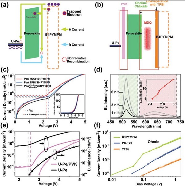 图一、基于不用电子传输层PeLEDs的基本结构与电学特性