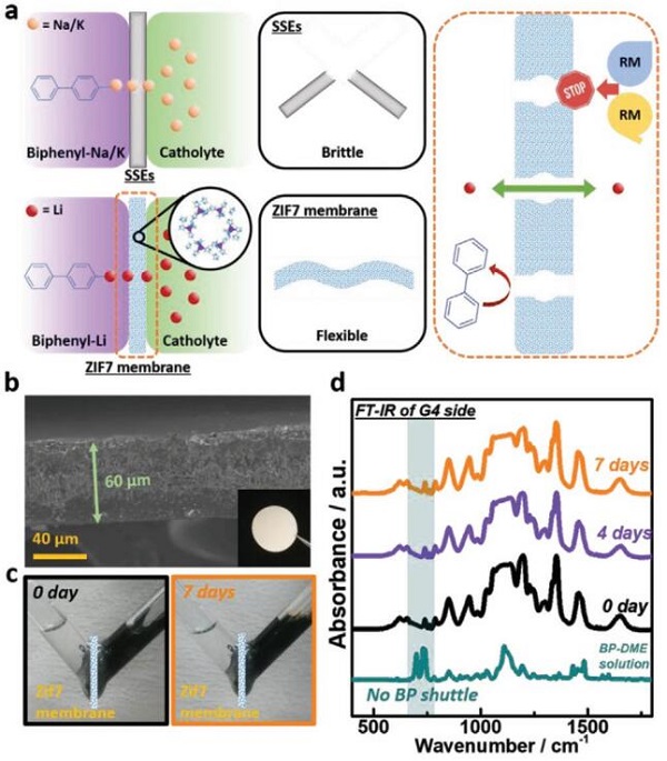 (a)使用SSEs的联苯-Na/K液态负极与ZIF-7隔膜的联苯-锂液态负极的示意图;