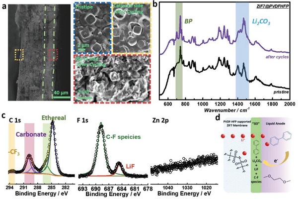 (d)形成类似SEI的ZIF-7/Bp-Li界面示意图。