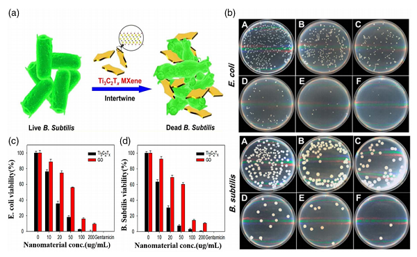 (b) Ti3C2Tx的浓度依赖性抗菌活性(A-F:0、10、20、50、100、200μg/mL)。(c) 大肠杆菌和枯草杆菌的细胞活力。