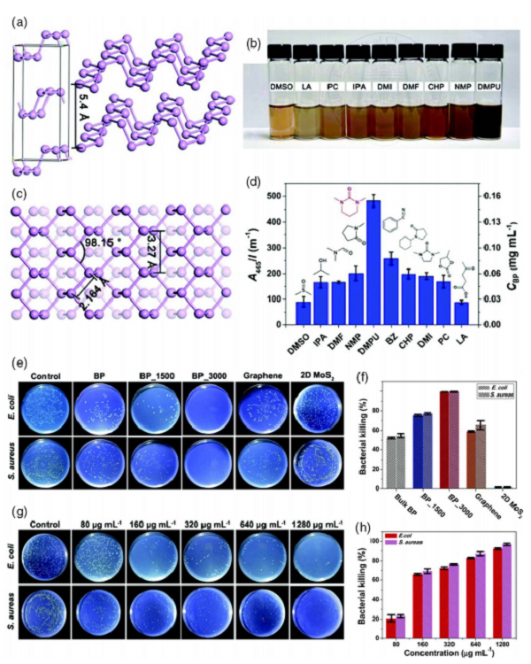 (g) 含不同浓度磷烯的大肠杆菌(上图)和金黄色葡萄球菌(下图)的菌落;(h)不同磷烯浓度下的细菌杀灭率。