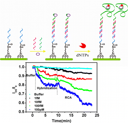 本文首次展示了一种基于硅纳米线场效应晶体管(SiNW-FET)的滚环扩增(RCA)技术,用于快速,无标记和特异的DNA检测。将探针DNA固定在SiNW的表面,然后与完全匹配的目标DNA和RCA引物进行夹心杂交,RCA引物充当与RCA模板杂交的引物。RCA反应产生了长的单链DNA(ssDNA)产物,因此显着增强了SiNW的电子响应。纳米传感器响应特定的靶DNA序列显示出高度敏感的浓度依赖性电导变化。由于大量重复序列的RCA产物结合在一起,因此1 fM DNA检测的SNR大于20,检测限为50 aM。SiNW FET传感器与RCA的组合将提高诊断能力,并增强实验室检测意外病毒的能力,使其成为早期诊断基因相关疾病的潜在工具。