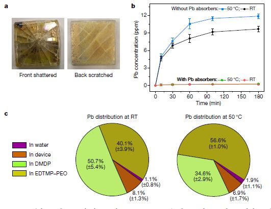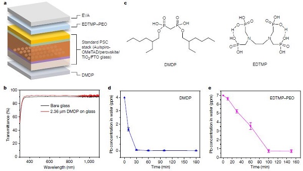 近期,美国北伊利诺伊大学的Tao Xu和可再生能源国家实验的Kai Zhu(共同通讯作者)等人合作发展了一种化学方法来解决由于器件损坏而引起的铅泄漏问题。研究人员分别在设备栈的电极上利用铅吸收材料进行涂覆。在透明导电电极上,研究人员利用含有膦酸基团的分子膜进行涂覆,膦酸基团与铅之间具有很强的键连作用,因此可以作为铅的吸收层。而在金属电极上,研究人员则将聚合物薄膜和铅螯合试剂的混合物嵌入到金属电极和标准的光伏包装膜(packing film)之间。研究人员表示,在这些涂覆层的作用下,遭水浸泡的器件中,铅更倾向于被吸收在电极上而不被溶解,保持了器件结构完整性以便集中收集处理铅。2020年02月19日,相关成果以题为“On-device lead sequestration for perovskite solar cells”的文章在线发表在Nature上。