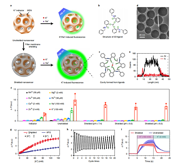 a,K+探针的设计示意图。K+指示剂载入MSN中。MSN表面的K+选择性薄膜仅允许K+进入;