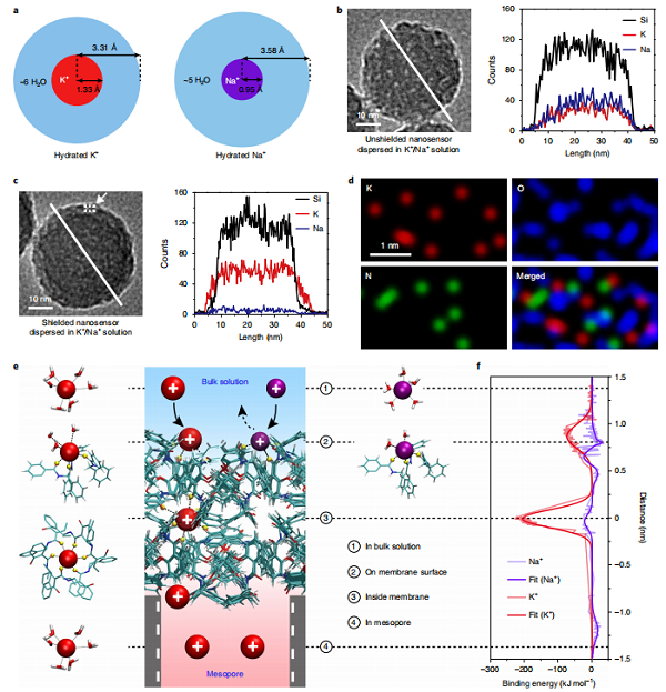 e,K+选择性薄膜腔与K+/ Na+之间相互作用的示意图:除去水合层后,K+与孔中的氧原子相互作用,这在能量上有利于K+的通过。但是,Na+无法与孔中的氧原子充分相互作用,这在能量上不利于粒径较小的Na+的通过;