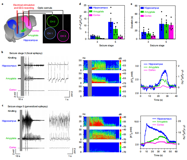 a, 在电点燃诱发的癫痫小鼠的三个不同脑区(海马体,杏仁核和皮质)同时进行EEG记录和光学[K+]o动态成像的实验设计图;