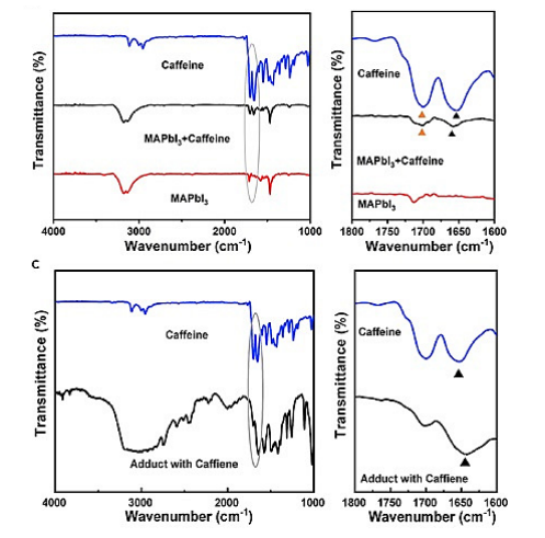 (2)杨阳教授研究团队发现[2],钙钛矿太阳能电池中加入咖啡因,可以使其具有较高的PCE和较好的稳定性。为探究定咖啡因是否成功地与钙钛矿结合,作者使用红外吸收光谱比较咖啡因、咖啡因与PbI2的混合物、以及咖啡因与钙钛矿前驱体(MAI、PbI2)的混合物,发现咖啡因在与钙钛矿结合后,咖啡因中的羰基的特征峰发生了移动,这进一步证明了咖啡因中的羰基是与钙钛矿中的铅相互作用形成了路易斯酸碱加和物。表明咖啡因和钙钛矿产生相互作用,这意味着咖啡因已经成功与钙钛矿结合了。这样的路易斯酸碱加和物使得钙钛矿晶体的成核的活化能提高,从而钙钛矿的结晶速度减缓,得到更高的结晶度,更具有晶粒取向性的高质量钙钛矿薄膜。
